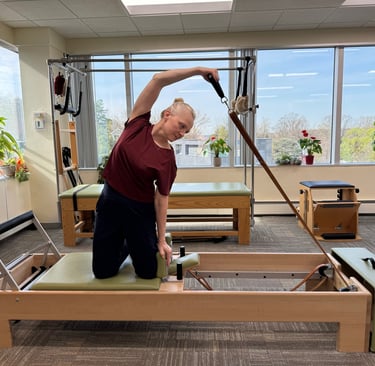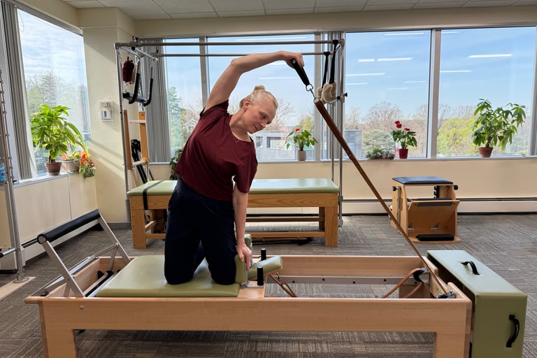 Finally, often to address a specific issue you may have in your body, you will do a couple of exercises on other Pilates apparatus. For example, to address weak abdominals or stiffness in the low back, you may do Roll Down (Reverse Breathing) exercise on the Cadillac. To begin addressing poor posture, you may do Standing Arm exercises on the Ped-O-Pull.